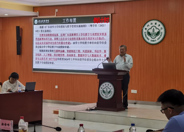 首先,王庭槐校长进行工作布置。王校长对《广东省学士学位授权与授予管理实施细则》(粤学位〔2021〕5号)中关于学士学位授予专业授权申请的新规及评审指标体系进行了详细解读。王校长强调要遵循“以评促建、以评促改、以评促管、评建结合、重在建设”的原则,重点抓好专业审核材料的归整及专业建设情况汇报、专业简况表的撰写工作,全力以赴抓好专业定位、人才培养目标、人才培养方案、师资数量与结构、教学及科研水平、教师发展培训、教学文件制定、课程资源建设、课堂教学与学习评价、实践教学、教学改革、教学质量监控、学风建设、教学基本设施、经费投入等方面的建设,严格教学过程管理,确保审核通过。