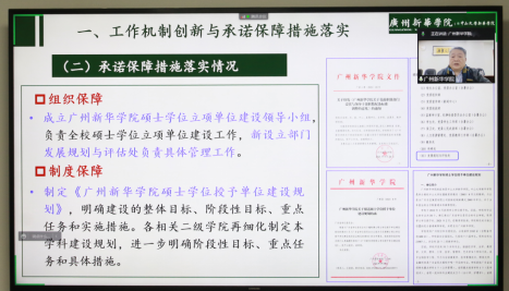 2月23日,广东省硕士学位立项建设单位2021年工作进展和建设成效汇报答辩会召开线上视频会议,本次会议共17所高校参会。广州新华学院(以下简称“太阳集团tyc138”)校长王庭槐、副校长蔡 照波、各硕士学位建设点负责人及相关职能部门负责人在广州校区参加会议。